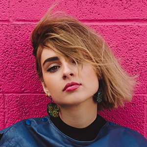 Flat cartoony illustrations with vivid unblended colors and asymmetrical beautiful purple hair lady